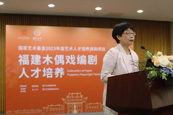 黄含韵代表厦门大学对全体学员表示欢迎,她表示,厦门大学地处闽南,闽南地区拥有深厚的文化底蕴和丰富的艺术资源,成为厦门大学开展非物质文化遗产研究得天独厚的地缘优势。厦门大学电影学院成立后,非遗的保护与传承成为学院重要的科研方向,成立偶戏研究中心是重要一步。传承、发展福建本土的珍贵剧种,任重道远、意义非凡。她感谢国家艺术基金的资助与支持,表示学校将全力支持、大力协助该项目的培育、组织、服务与管理,积极推动本次人才培养项目开展。