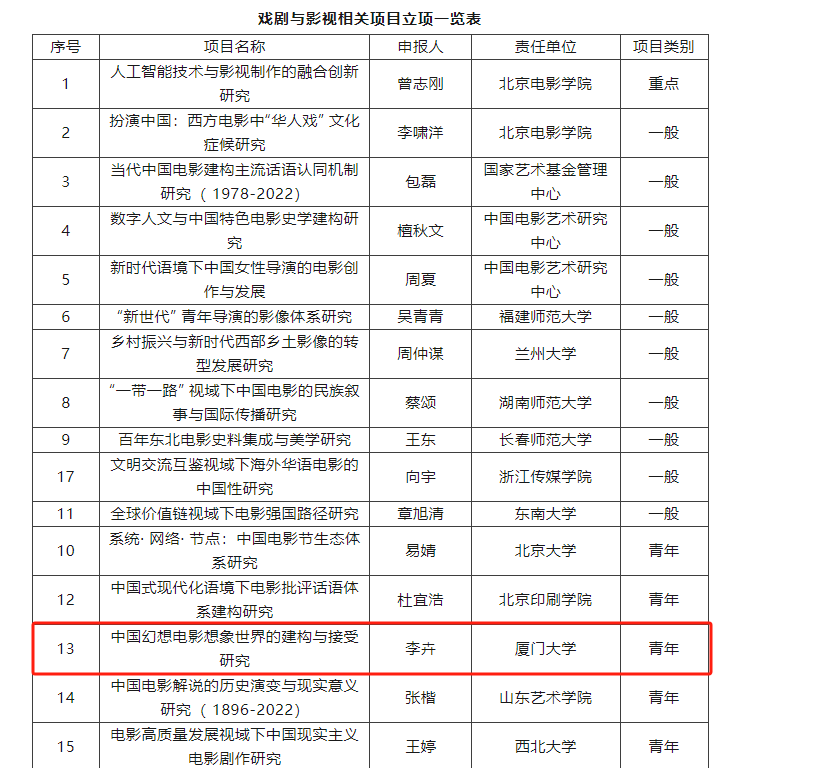 近期,全国艺术科学规划领导小组办公室公示了2023年度国家社科基金艺术学项目立项名单,全国共立项235项,其中戏剧与影视相关方向共40项。由电影学院李卉助理教授申报的戏剧与影视方向项目《中国幻想电影想象世界的建构与接受研究》获批立项,这也是本年度厦门大学唯一获批立项的国家社科基金艺术学项目。