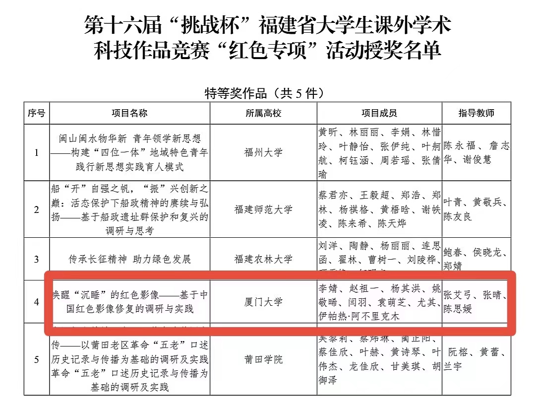 近日,第十六届“挑战杯”福建省大学生课外学术科技作品竞赛“红色专项”活动获奖名单公布。厦门大学电影学院作品《唤醒“沉睡”的红色影像——基于中国红色影像修复的调研与实践》荣获特等奖,成为我校在“红色专项”活动唯一荣获特等奖的作品,全省共评选5项特等奖,学院首次参加“挑战杯”大学生课外学术科技作品竞赛省赛即夺得佳绩。该作品由电影学院副教授张艾弓、党委副书记张晴、工程师陈思媛等指导。参赛作品以影像修复为主题,聚焦红色影像,实现了理论与实践的紧密结合。团队成员依托现有资源,通过文献研究、问卷调查、焦点访谈、实践调研等方法深度剖析中国红色影像的修复现状。