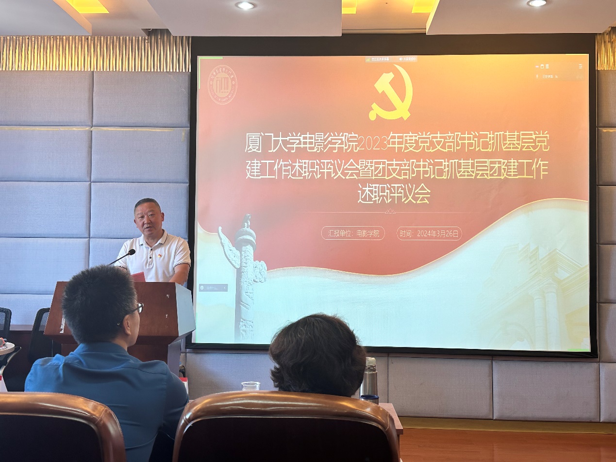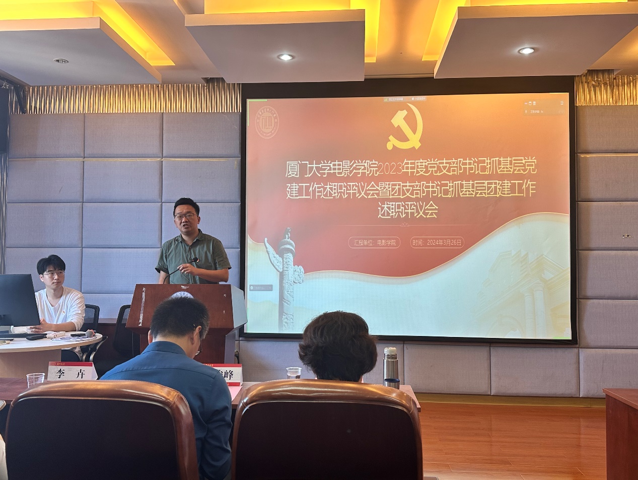 2024年3月26日,厦门大学电影学院在海韵园科研一310举行2023年度党支部书记抓基层党建工作暨团支部书记抓基层团建工作述职评议会。厦门大学基层党建工作联络员郑冰冰,电影学院党委书记林公明,党委委员、副院长姚俊峰,各党支部、团总支、团支部书记、副书记、委员,班主任、师生党员、入党积极分子、团员代表参加会议。会议由院党委副书记张晴主持。