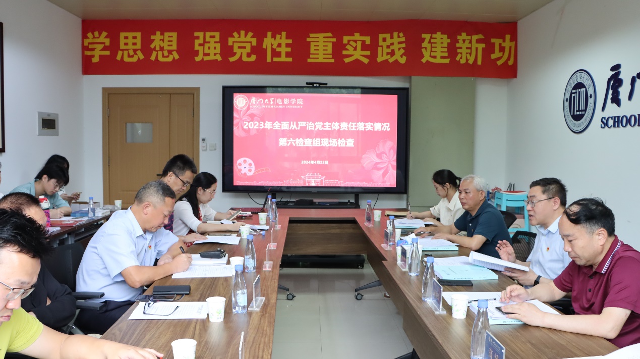 4月22日下午,校党委2023年全面从严治党主体责任落实情况第六检查组到电影学院现场检查全面从严治党主体责任落实情况。第六检查组组长、校党委常委、副校长方颖,第六检查组副组长、校党委常委、宣传部部长、教师工作部部长高和荣以及组员林金宝、高斌、陈心怡(兼联络员)等参加检查。学院党委书记林公明、常务副院长谢晓晶以及全体党政领导班子成员、党委委员、师生党支部书记、党务秘书、辅导员等参加会议。