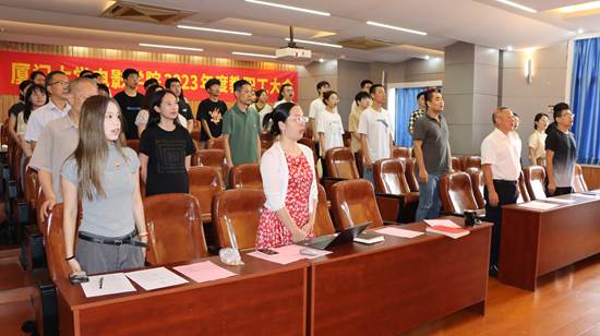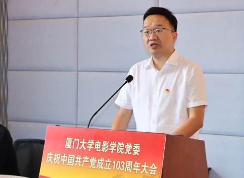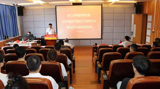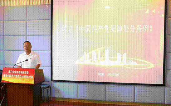 2024年7月1日下午,厦门大学电影学院党委庆祝中国共产党成立103周年大会暨党纪学习教育专题党课在海韵园召开。电影学院党委书记林公明,院党委委员、教工党支部书记吴清强出席,学院师生党员、入党积极分子代表参会,会议由院党委副书记张晴主持。