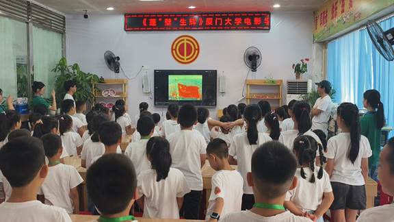 数字媒体技术专业本科生陈俊龙放映并讲解了《我和我的祖国》中聚焦开国大典升旗仪式的《前夜》和聚焦北京2008年奥运会的《北京你好》。小朋友们陶醉在电影的魅力中,目不转睛。在《前夜》放映中,随着电影中五星红旗冉冉升起,小朋友们情不自禁地起立齐声高唱国歌,教室里洋溢着爱国热情。随后,陈俊龙为小朋友们讲解了电影的拍摄过程和制作方式,富有亲和力的讲解方式让在场小朋友们深受感染、热烈互动。