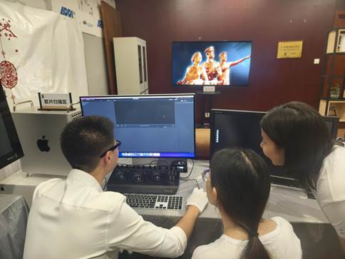 随后,实践队来到长影旧址博物馆AI视频增强实验室,学习胶片电影数字扫描与数字修复工艺,并与长影数字修复专家进行研讨。修复专家展示达芬奇软件胶片扫描仪的扫描与校准功能,讲解胶片电影数字化扫描与上传流程。实践队近距离学习并扫描胶片电影扫描,同时就“惜影力”影像修复团队“ai+人工”的独家修复工艺与长影修复专家进行研讨学习,收获颇丰。