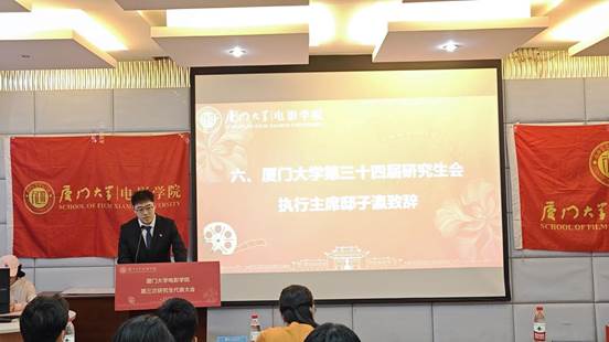 厦门大学第三十四届研究生会执行主席邸子瀛在致辞中肯定了过去一年电影学院研究生会取得的成绩,并对新一届电影学院研究生会工作提出期盼。