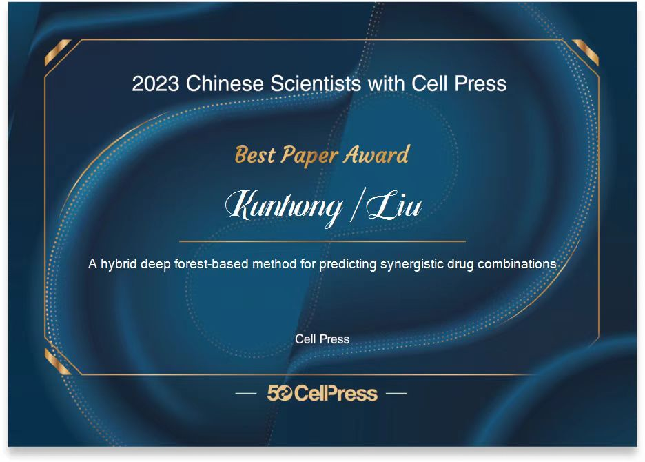 经Cell Press(细胞出版社)编辑部提名、第三方专家委员会的独立评审,并综合论文下载量、引用量和领域内突破性等权衡标准,从出版社旗下42本混合型期刊发表的2080篇论文中,评选出生命科学领域、交叉学科领域等五个领域的“细胞出版社 2023 中国年度论文”共 40 篇。其中,我院刘昆宏教授作为第一通讯作者发表在Cell Reports Methods 期刊上的论文A hybrid deep forest-based method for synergistic drug combination prediction获评Cell出版社中国科学家交叉科学领域年度论文奖。