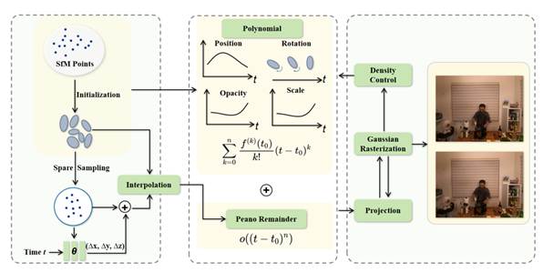 论文提出了一种基于可学习无限泰勒级数方法,用于建模高斯动态的时序演化。捕捉高斯属性(如位置、旋转和尺度)的时序变化是一项极具挑战性的任务,因为其涉及大量的时变参数和有限的光度数据,这通常会导致收敛问题,难以找到最优解。虽然将所有输入数据输入端到端的神经网络可以有效建模复杂的时序动态,但这种方法缺乏显式监督,并且难以生成高质量的变换场。另一方面,使用时间条件多项式函数来建模高斯轨迹和方向虽然提供了更明确和可解释的解决方案,但需要大量的手工设计工作,并且缺乏在多样化场景中的泛化能力。为克服这些限制,本文提出了一种基于可学习无限泰勒级数方法,该方法结合了隐式网络方法的灵活性和显式多项式函数的可解释性,能够更稳健地建模高斯动态,并在各种动态场景中实现更好的泛化性能。