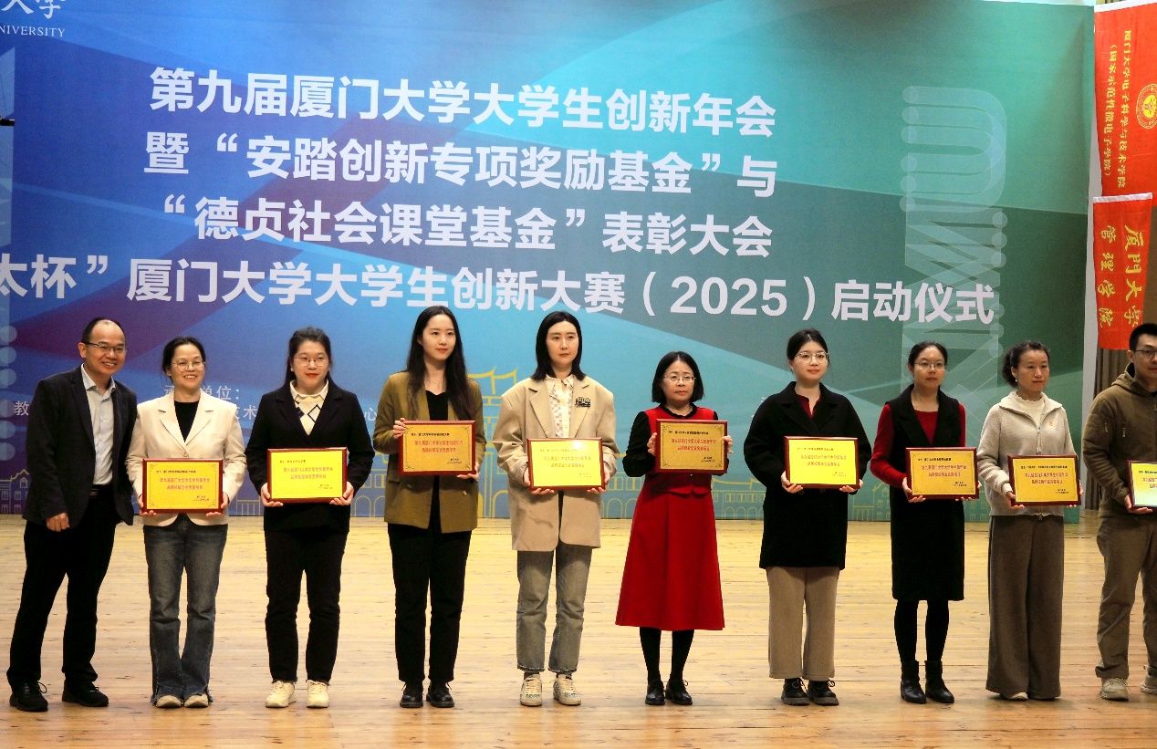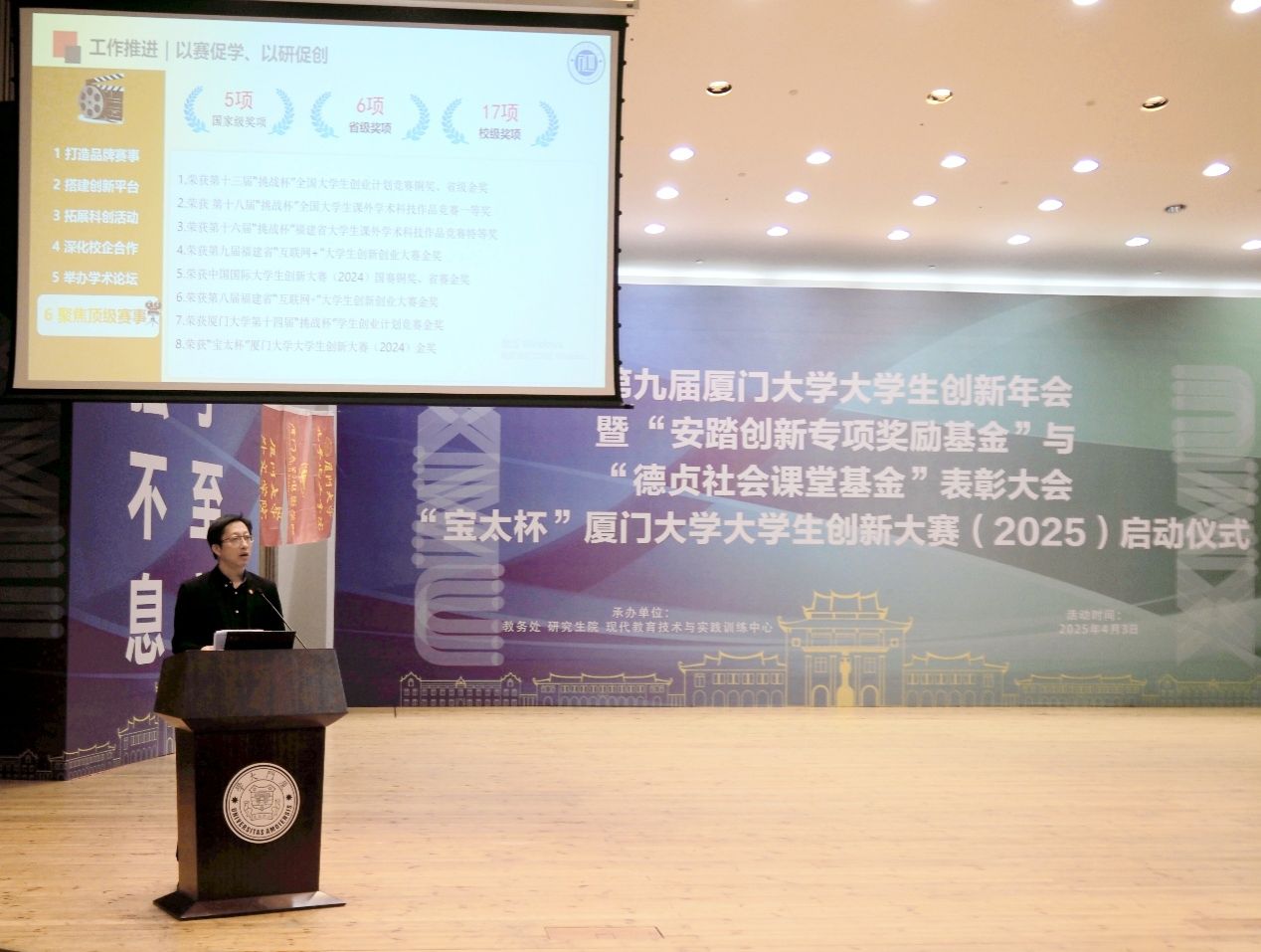 第九届厦门大学大学生创新年会暨“安踏创新专项奖励基金”与“德贞社会课堂基金”表彰大会、“宝太杯”厦门大学大学生创新大赛(2025)启动仪式于2025年4月3日在科艺中心音乐厅举行。