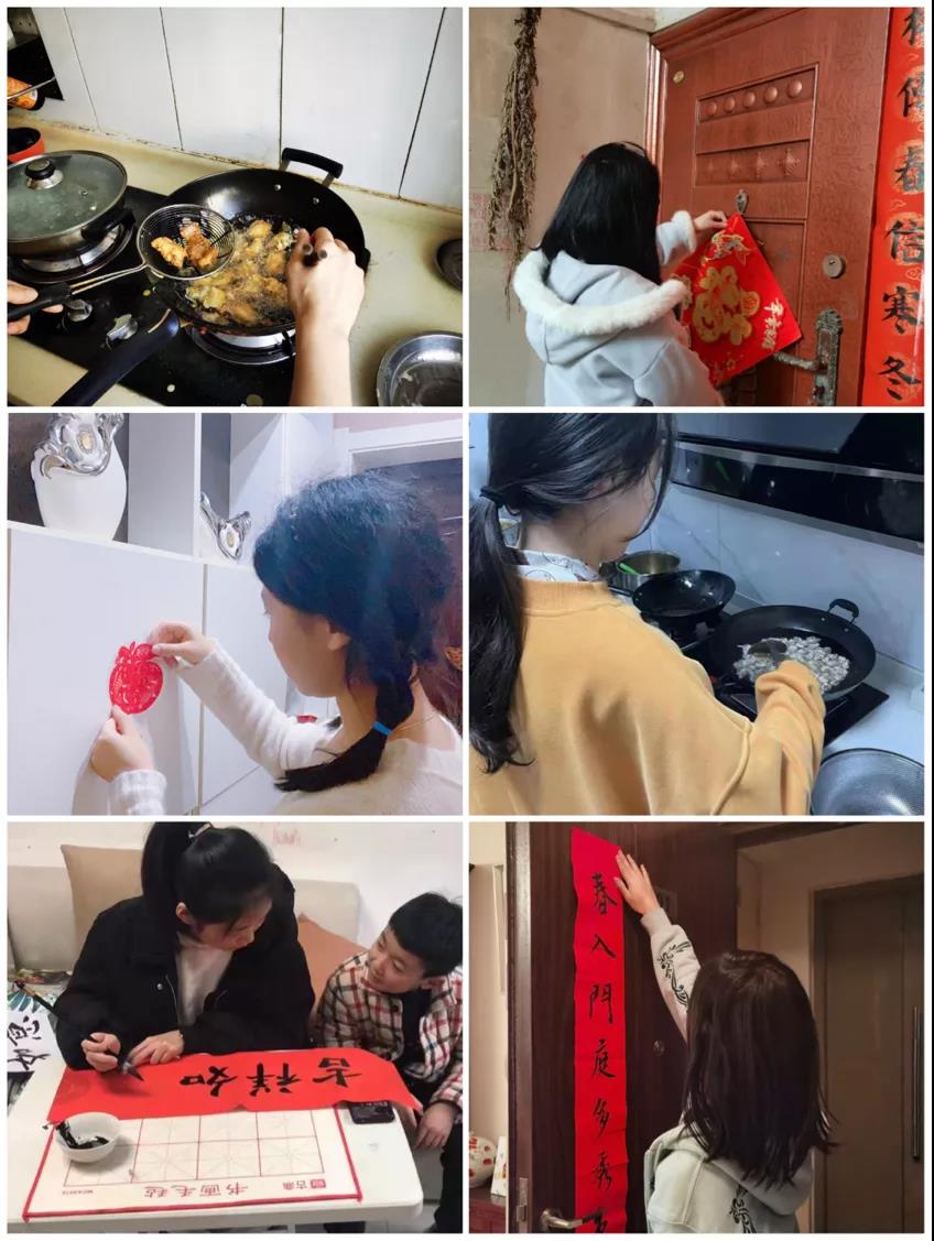 返乡的同学们在家帮助父母进行力所能及的家务劳动,有的打扫卫生,出去旧尘,扫出一个清新整洁的小屋;有的操刀舞铲,化身“中华小当家”,亲手为家人下厨做菜,炒出一桌美味年夜饭;有的爬窗登梯,贴窗花、挂灯笼、写春联,装出一个虎味浓郁的新年家装。“虎步奔腾开盛景,春风浩荡展宏图”,还有的同学挥毫泼墨,用墨笔抒写对新年祖国的美好祝福。新的一年,全新的开始,许愿虎年大展宏图,虎虎生威。