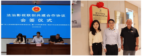 杨善良、林公明、张枥文分别代表厦门市人民检察院宣传和教育培训处、厦门大学电影学院、海丝中央法务区检察服务中心签订联创共建协议,共同为“厦门大学电影学院法治影视实践思政教育基地”揭牌。