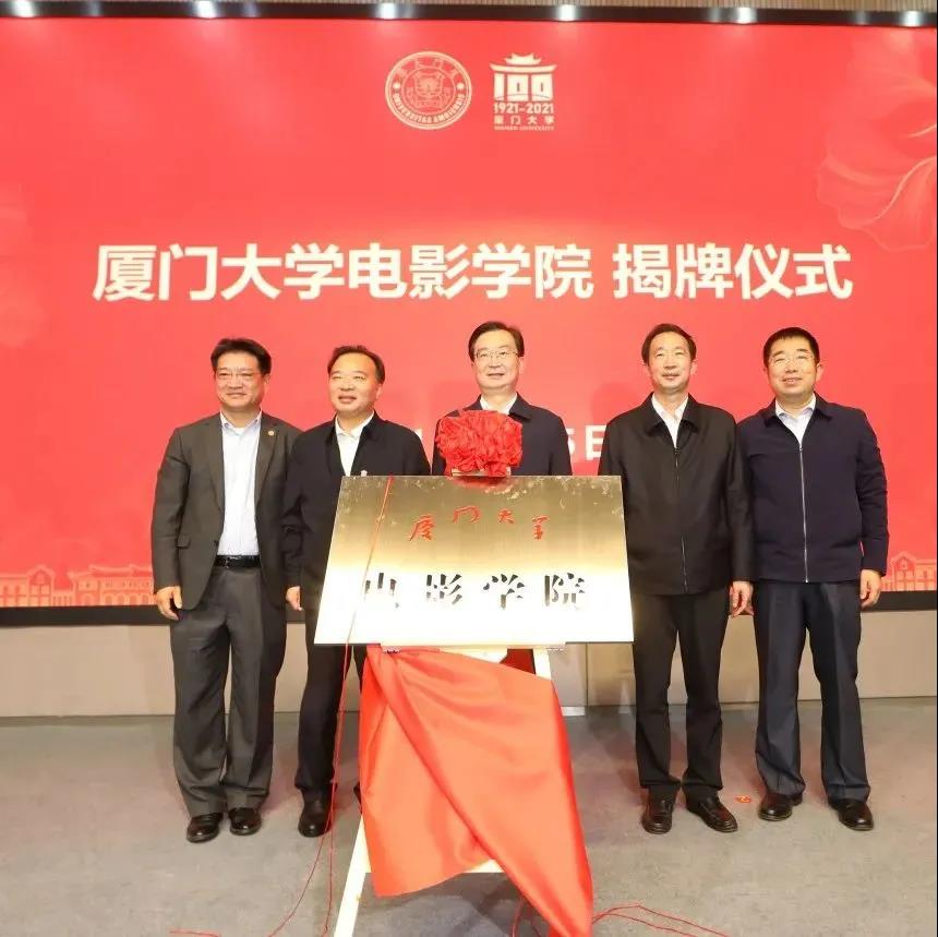 (福建省时任省长王宁、福建省副省长李德金、厦门市时任副市长孟芊与厦门大学党委时任书记张彦、厦门大学副校长江云宝等校内外领导共同为厦门大学电影学院揭牌)