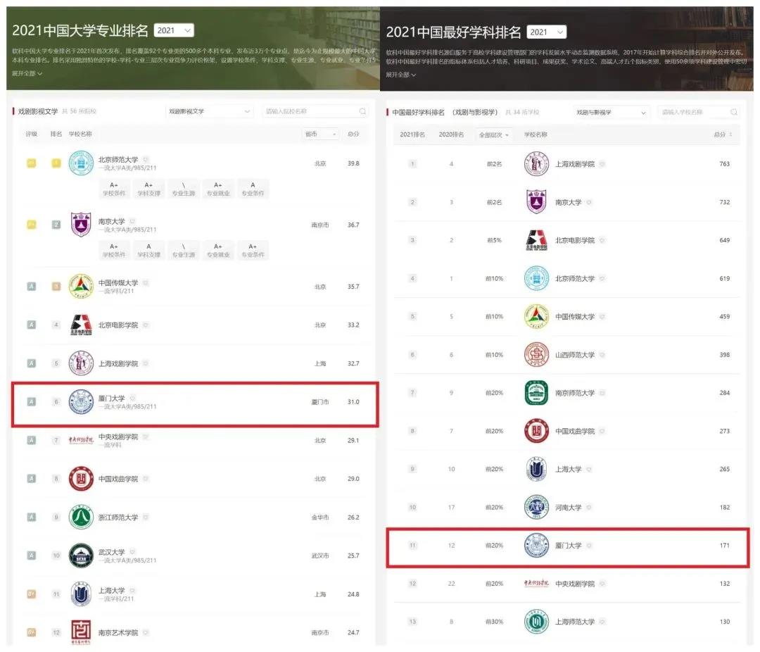在2021软科中国大学专业排名中,厦门大学戏剧影视文学专业排名全国第6;在2021软科中国最好学科排名中,厦门大学戏剧与影视学排名全国第11。