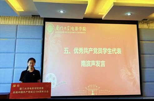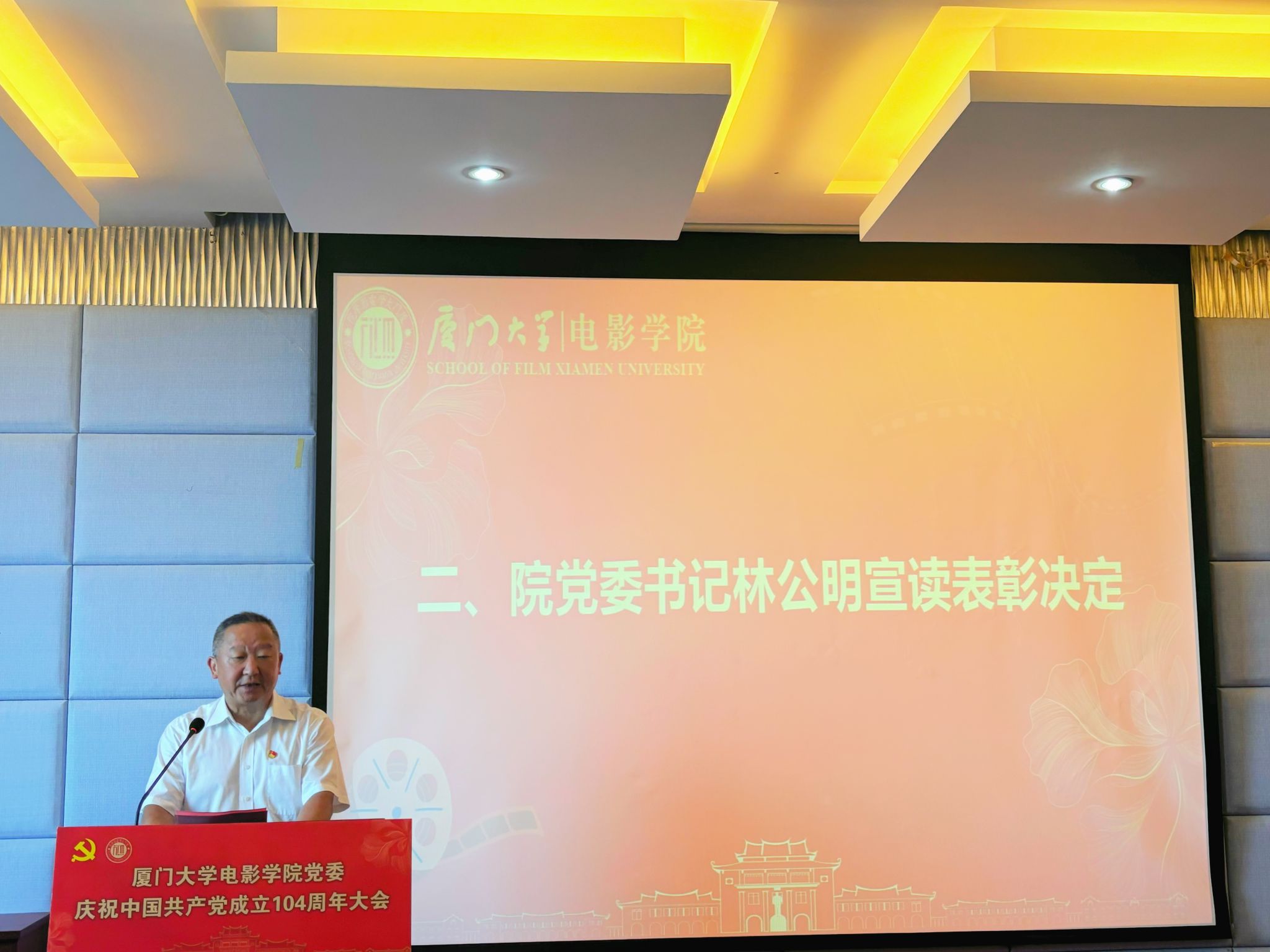2025年7月1日上午,厦门大学电影学院党委在海韵园科研一310教室隆重举行庆祝中国共产党成立104周年暨“两优一先”荣誉表彰会议。电影学院党委书记林公明、常务副院长李晓红、关工委常务副主任黄鸣奋出席,学院师生党员、入党积极分子代表参会,共同回顾党的光辉历程,表彰先进典型,凝聚奋进力量。会议由院党委副书记高斌主持。