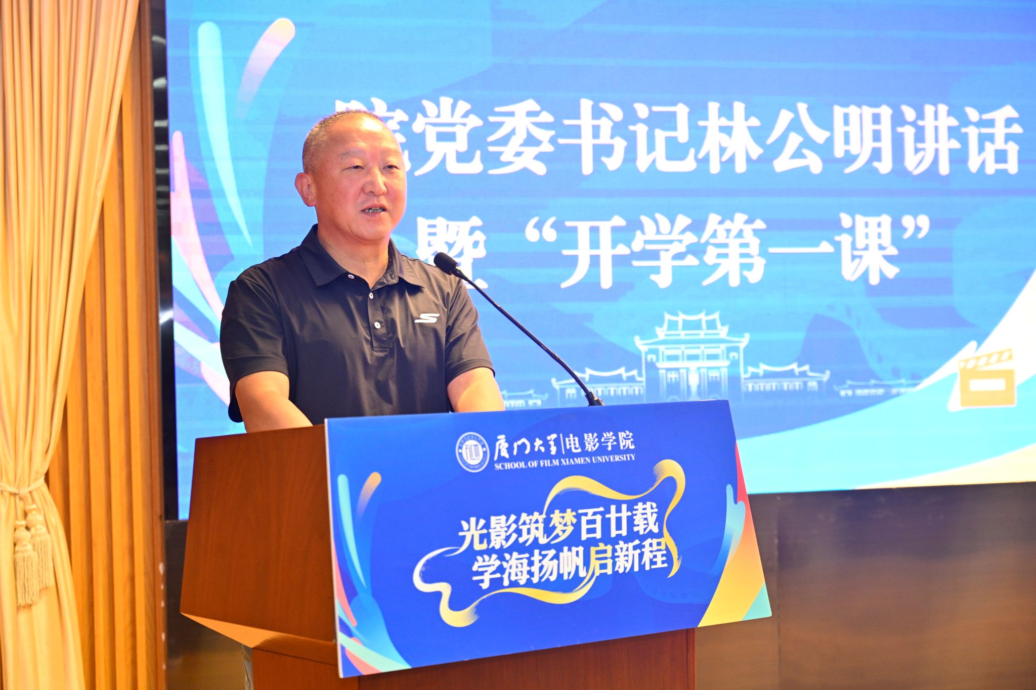 9月2日下午,电影学院党委书记林公明以《光影筑梦,桃李无言》为题,为电影学院2025级全体新生讲授“开学第一课”。“开学第一课”由学院党委副书记高斌主持。