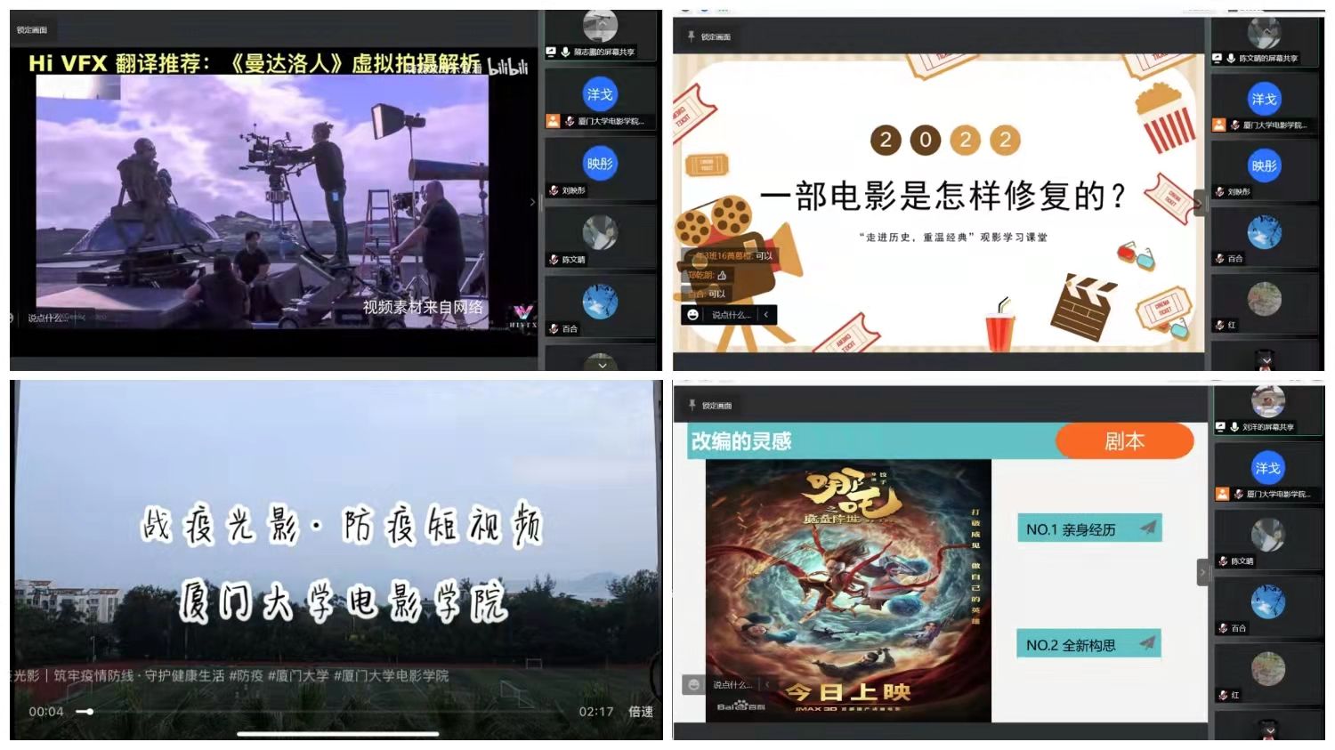 3月20日,第一期社区小课堂如约而至。活动采用线上形式,由四位志愿者结合学院专业特色和当下疫情形势,为社区小朋友们带来虚拟拍摄科普、胶片电影修复、电影《哪吒》鉴赏、防疫小视频等精彩内容,15位小朋友和家长参与活动。