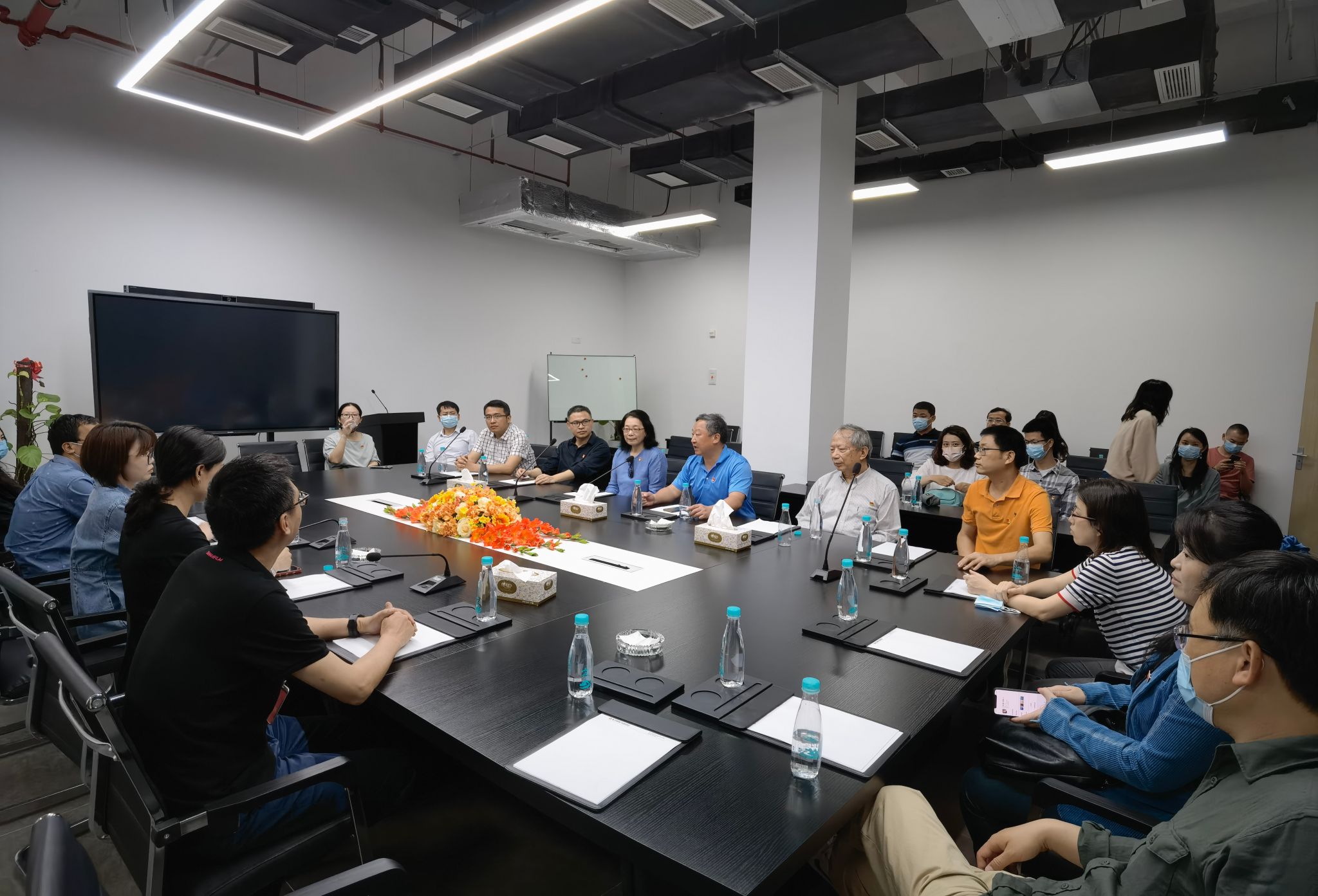 参观结束后,调研团与基地负责人进行座谈,与会人员就党建合作、就业创业、电影学院院楼建设、产学研对接等方面交换意见和建议,表达对电影学院、基地建设、厦门电影产业发展的期待与展望。