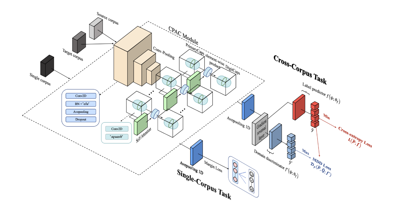 为应对这一挑战,本文通过在胶囊网络中嵌入自注意机制,设计了卷积-池化和注意力胶囊模块的组合,可以通过关注输入不同胶囊的重要特征来增强高阶特征的判别能力。此外,为处理跨语料库的任务,本文提出了一个语料库适应对抗模块,在卷积-池化和注意力胶囊模块融入间隔差异散度,提取强情感共性特征,有效增强域不变情感表征。论文使用四种著名的语音情感识别数据集,进行单语料库和跨语料库任务的实验。基于包括消融实验和可视化分析,有效验证了在这两项任务中,本文提出的方法与一些最先进的方法相比,在所有情况下都显示了更好的性能。
