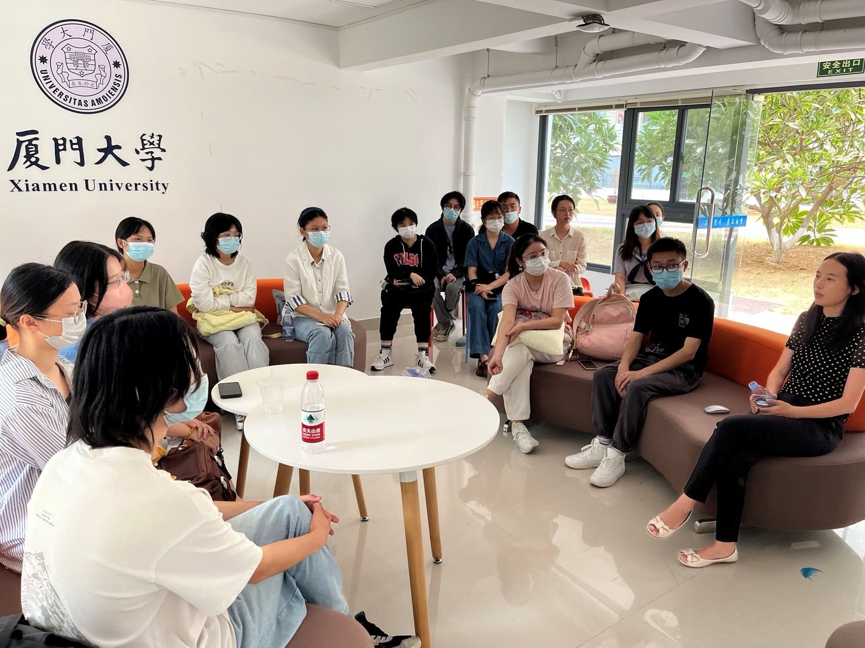 陈俐燕还向同学们介绍了学院正在进行的学科专业交叉工作,并与同学们就交叉创新如何在项目中成功落地展开交流探讨。同学们逐一介绍了自己的优势和特长,并提出诸多问题,现场气氛热烈融洽。陈俐燕欢迎各位同学积极参与到学院各团队、课题、项目和作品中,发挥所长,积极培养跨学科思维,将“厦大电影出品” 落地落实落细。