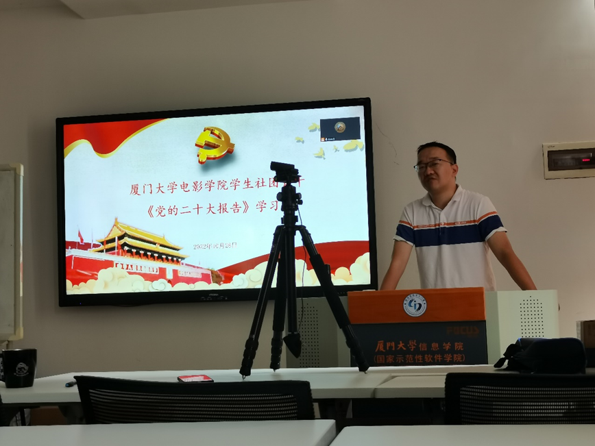 育人是社团的第二功能。张晴带领着学生社团骨干、指导教师开展《党的二十大报告》学习。习近平总书记在《党的二十大报告》中指出,增强中华文明传播力影响力,坚守中华文化立场,提炼展示中华文明的精神标识和文化精髓,加快构建中国话语和中国叙事体系,讲好中国故事、传播好中国声音,展现可信、可爱、可敬的中国形象。电影学院在中华优秀传统文化保护、传承和创新上有着丰沃的土壤和良好的基础,与众多国际知名电影院校开展合作,为促进中华文化海外传播贡献了自身力量。