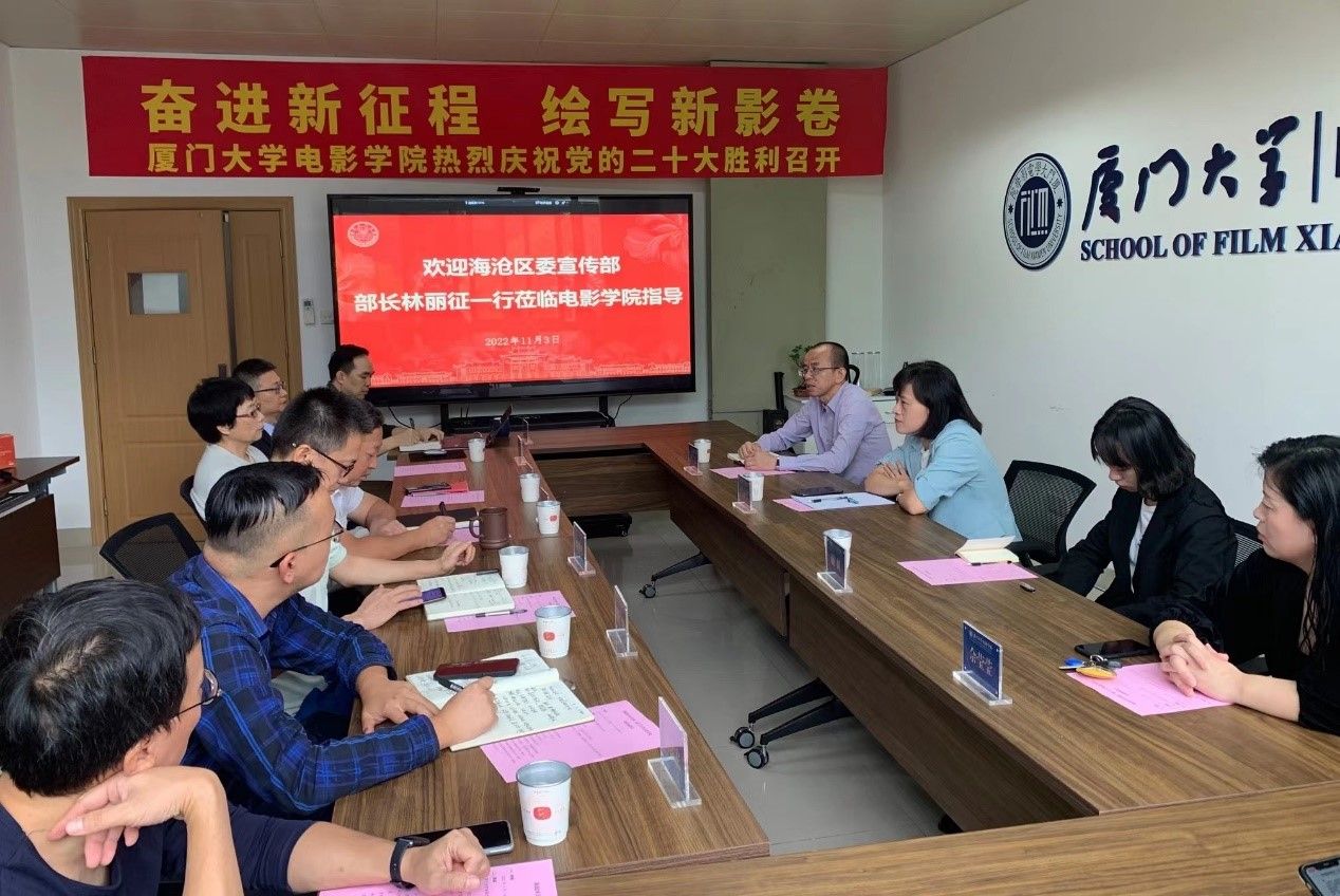为认真学习宣传贯彻党的二十大精神,推动厦门市海沧区电影、文旅产业发展,加强校地合作共建,11月3日上午,海沧区委常委、宣传部部长林丽征一行到访厦门大学电影学院交流座谈,电影学院党委书记林公明接待了调研团一行。
