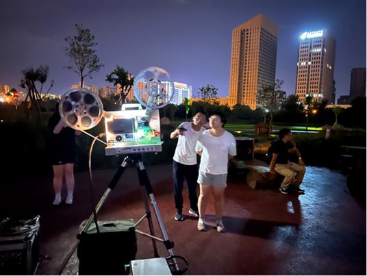 杨保华和内蒙古电影博物馆副馆长巴图、王连起、周学军还带领实践团前往呼和浩特市小草公园,观摩由他们组织的“喜迎二十大 奋进新征程”红色电影展映活动。他们将馆藏的《东方红》等经典胶片电影开展为期两个月的放映活动,吸引了众多市民的关注和观看。