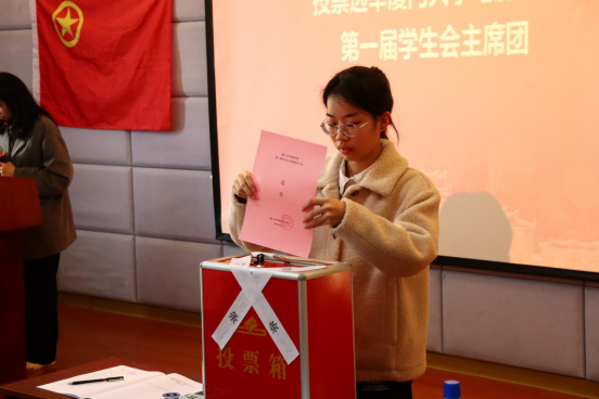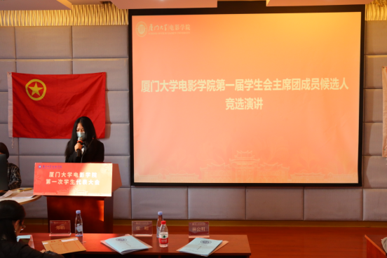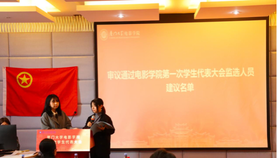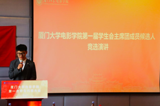 大会分别审议通过了《厦门大学电影学院学生会工作报告》《厦门大学电影学院第一届学生会主席团成员选举办法》《厦门大学电影学院第一次学生代表大会监票人、计票人名单》《厦门大学电影学院第一届学生会主席团成员候选人建议名单》,选举产生了厦门大学电影学院第一届学生会主席团:祝赫宁 汪艳 刘玉东。