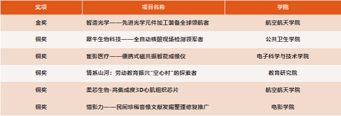 此外,我校还有5件作品获得本届赛事铜奖,分别是公共卫生学院《犀牛生物科技——全自动核酸现场检测领军者》、电子科学与技术学院《雀影医疗——便携式磁共振智能成像仪》、教育研究院《情系山河:劳动教育振兴“空心村”的探索者》、航空航天学院《柔芯生物-高集成度3D心肌组织芯片》、电影学院《惜影力——民间珍稀音像文献发掘整理修复推广》。