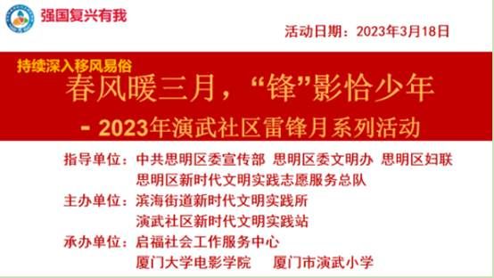 3月18日上午,厦门大学电影学院“青影说”社区电影小课堂第四期开讲,两位志愿者为厦大北村演武社区小朋友带来有关雷锋精神的介绍和相关影片的鉴赏。本次活动紧扣“雷锋月”主题,以课堂交流分享形式搭建雷锋精神学习平台,帮助社区青少年了解雷锋精神,发扬雷锋精神,努力成长为新时代优秀青年。