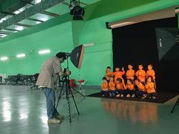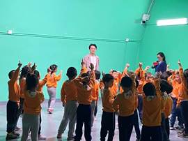 志愿者吴明昊引导小朋友们观察陌生的场地,他们留意到绿色的背景墙,激发好奇心,进而以明白易懂的语言讲述绿幕的作用,延伸到摇臂、聚光灯等器械的用途,介绍影视制作的流程。同时,通过互动问答的方式,志愿者询问小朋友们喜欢的电影,鼓励小朋友们勇敢表达,激发他们对电影的兴趣。