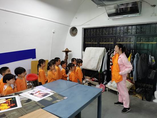 棚拍后,小朋友们来到场地的另一侧,志愿者谢粟湘为小朋友们介绍存放于现场的服装道具,说明其用于演绎话剧和电影,鼓励小朋友们积极参加文艺演出。