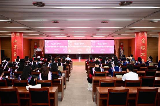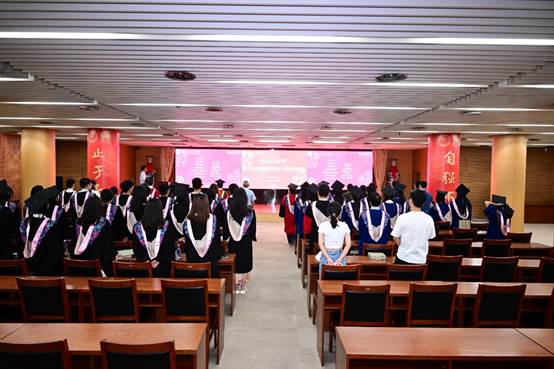 典礼最后,在热烈的掌声和乐曲声中,学院教师们走上主讲台为毕业生们拨穗祝福。这一仪式既象征着毕业学子们获得学校认可,告别这一阶段的校园生活,也饱含了老师们对毕业生的祝福与希望。大家面带笑容,郑重接受拨穗,互相拥抱庆祝,倾吐毕业的喜悦与分离的遗憾。