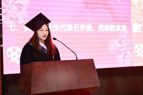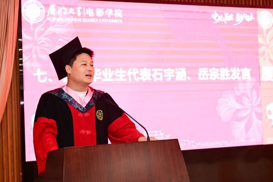 岳宗胜自豪地将本届毕业生称为“天选之子”——目睹了金鸡奖在厦门长期举办的盛况,感受金鸡的东风吹拂闽南大地;参与了厦门大学百年校庆活动,感受到以嘉庚精神作为代表的爱国主义精神引领下的自强和至善的品格;亲眼见证了电影学院的诞生,用南光楼的轰鸣和鞭炮声告别了岁月悠长的历史,自信迈入了充满活力和崭新征程的电影学院……而如今面临毕业离校,大家站在一个重要的人生节点上。岳宗胜鼓励道,要坚信成功将在前行的道路上的某一步迎面而来,当那一刻到来时,所走过的每一条路都将成为一条花路、充满绚丽的成就和奇迹。