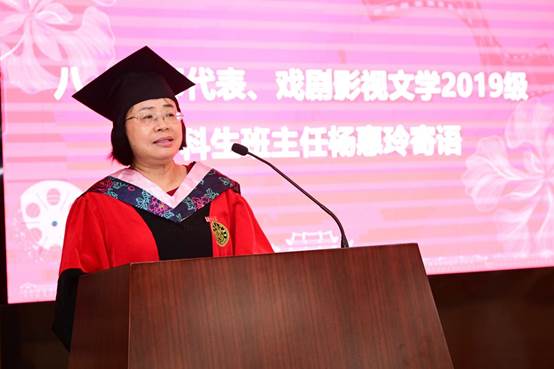 2019级戏剧影视文学本科生班主任杨惠玲教授的毕业寄语深情而充满智慧。她回顾了毕业生们在疫情期间所面对的困难和挑战,感动于毕业大戏的精彩表现以及硕博士生们的扎实学术素养,并称赞了他们的成长和进步。她鼓励毕业生们在追求个人幸福的同时,关注他人的困境,并以真诚之心帮助他人。她强调了理性和良知对于人类未来的重要性,并期望毕业生们能以智慧和热忱记录和传递积极向上的价值观,为社会的进步做出贡献。最后,她引用了惠特曼《大路之歌》中的诗句,表达了对毕业生们的祝福和鼓励,希望他们在人生的道路上保持健康、自由,并实现自己的幸福。