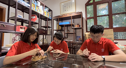 实地调研前,实践队召开了“用非遗讲好中国故事研讨会”,并在第一站前往中共杭州小组纪念馆,通过红色教育坚定理想信念,启迪和引导实践方向。通过调研中多次研讨,实践队聚焦“讲好中国故事、传承中华文化”的目标,以金石篆刻非遗为切入点,践行用非遗讲好中国故事、传承中华文化的现实路径与创新模式。