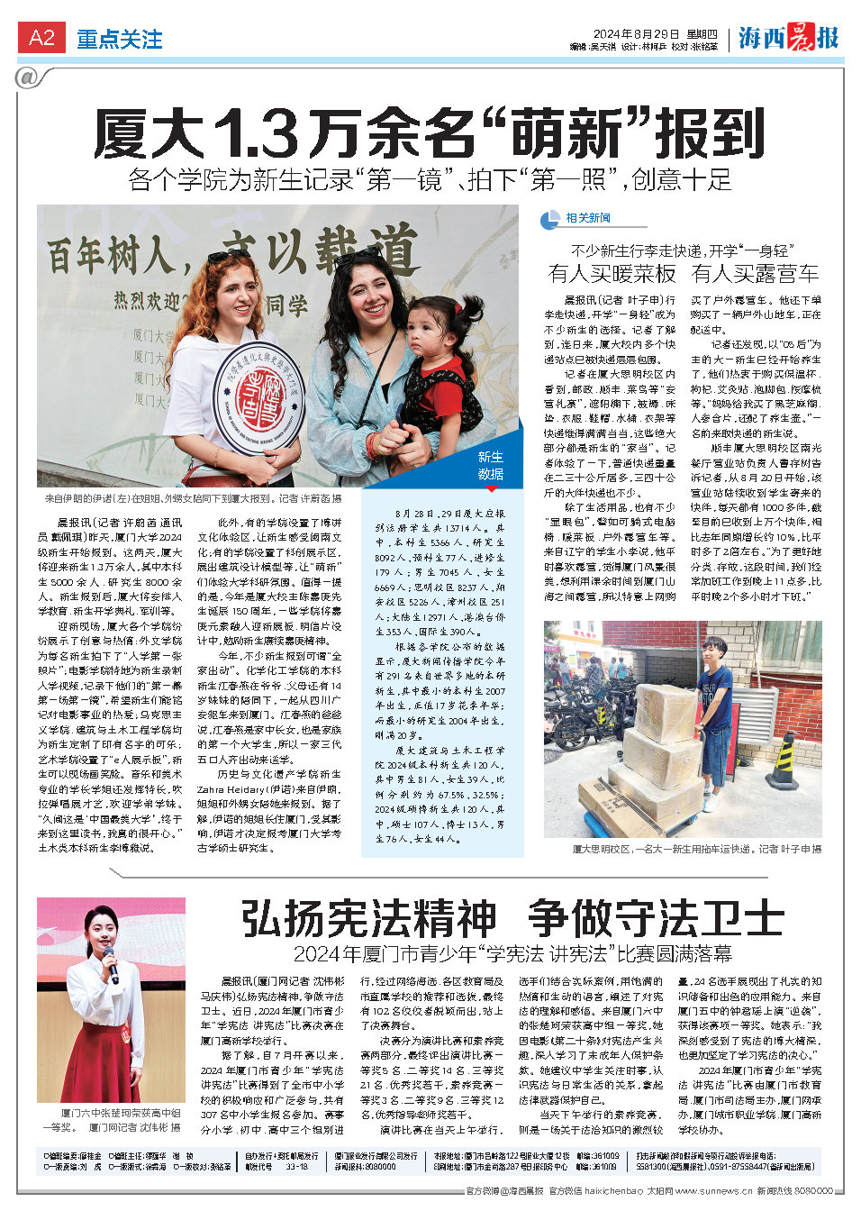 晨报讯(记者 许蔚菡 通讯员 戴佩琪)昨天,厦门大学2024级新生开始报到。这两天,厦大将迎来新生1.3万余人,其中本科生5000余人、研究生8000余人。新生报到后,厦大将安排入学教育、新生开学典礼、军训等。