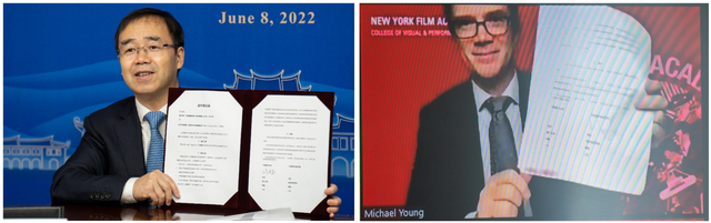 6月8日上午,厦门大学与美国纽约电影学院合作备忘录签约仪式以线上线下相结合的方式举行。校长张宗益,纽约电影学院校长Michael Young、执行副校长朱宇华出席,中华人民共和国驻纽约总领事馆教育参赞杨军见证签约仪式。国际合作与交流处处长蔡舜主持仪式。
