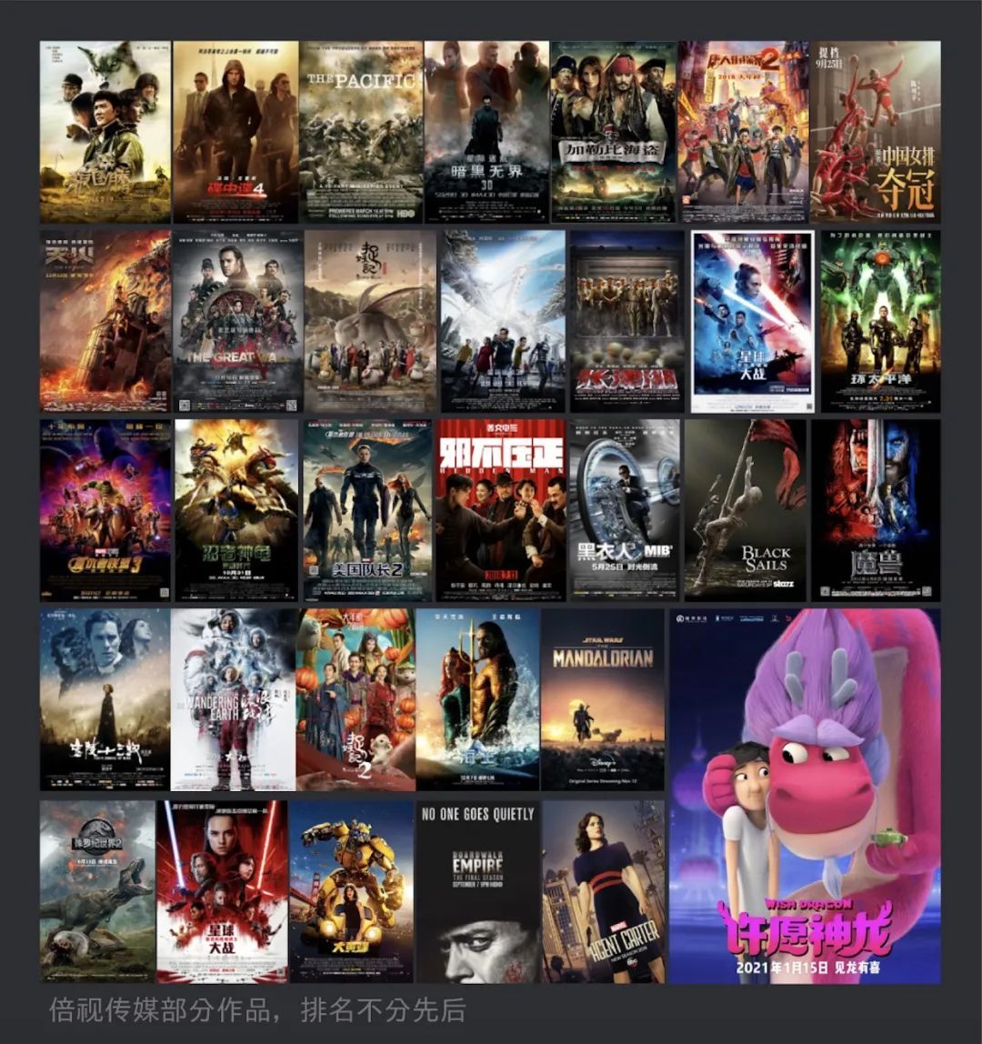 倍视视效(Base FX)拥有最高端的实拍电影和动画电影项目,搭建起了业界领先的制作流程。公司于2012年与卢卡斯影业及工业光魔签订战略合作协议,将好莱坞大片的制作业务引进中国,并为中国导演提供国际高端创意、视觉特效相关的技术支持。倍视传媒曾三度获得艾美奖,两度获得奥斯卡最佳视效奖提名,参与制作了《星球大战》《美国队长3》《长津湖》《夺冠》《捉妖记》等国内外热门影片。