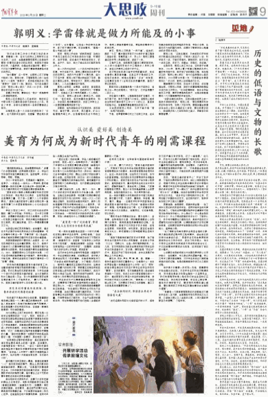 用美育塑造新时代青年的人生美学,这一点也获得哲学系主任朱菁的赞同。他认为,美育不仅能够对人们看待事物的角度、格局等方面产生潜移默化的影响,而且也能提升青年创造美的能力。如今,随着新媒体以及网络技术发展,人们对生活中美的鉴赏需求在不断提升,美学的概念不断发展,美育也逐渐变成了新时代青年的一门“刚需”课程。