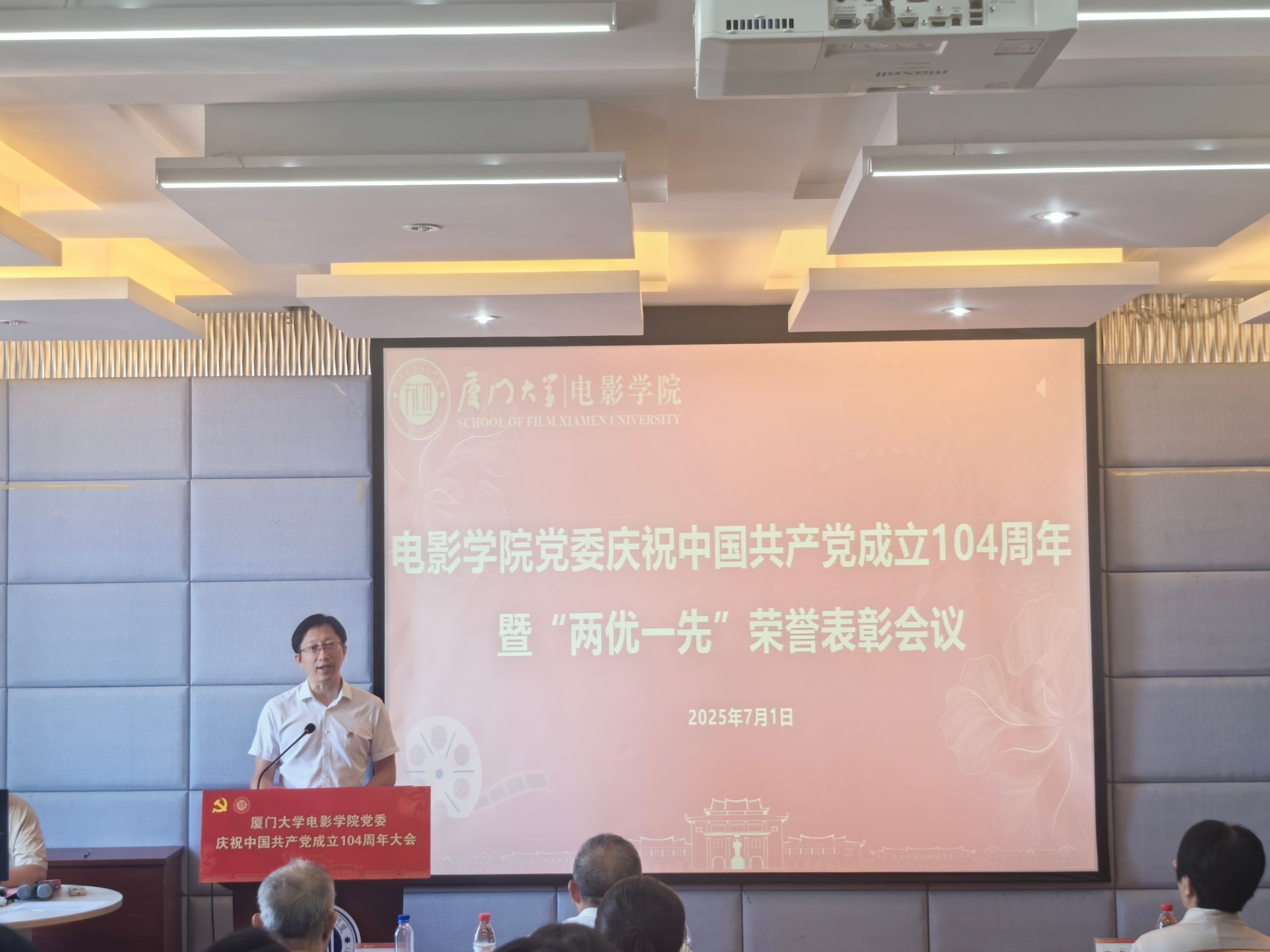 2025年7月1日上午,厦门大学电影学院党委在海韵园科研一310教室隆重举行庆祝中国共产党成立104周年暨“两优一先”荣誉表彰会议。电影学院党委书记林公明、常务副院长李晓红、关工委常务副主任黄鸣奋出席,学院师生党员、入党积极分子代表参会,共同回顾党的光辉历程,表彰先进典型,凝聚奋进力量。会议由院党委副书记高斌主持。