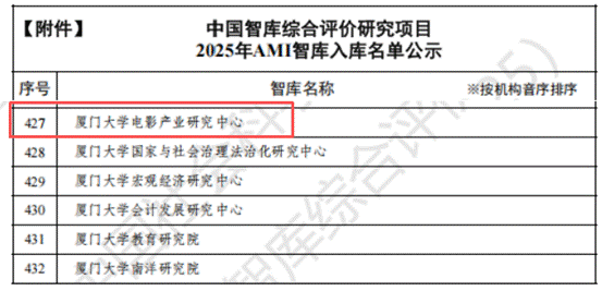 厦门大学电影产业研究中心凭借在影视产业研究领域的突出成果与学术影响力,成功入选中国智库综合评价研究项目2025年AMI智库。这是中心建设发展过程中的重要里程碑,标志着其在学术研究、政策服务和社会影响力等方面得到国家级平台的高度认可。