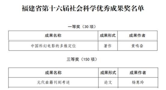 近日,福建省社会科学优秀成果奖评选结果正式揭晓,我院共有两项成果斩获殊荣,其中黄鸣奋教授的著作《中国科幻电影的多维定位》获一等奖、杨惠玲教授的论文《元代曲籍刊刻考述》获三等奖,充分彰显了学院在哲学社会科学研究领域的深厚积淀与创新活力。