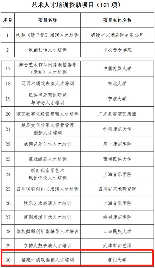 3月3日,国家艺术基金管理中心公示了国家艺术基金(一般项目)2023年度资助项目名单,由电影学院王晓红副教授申报的项目《福建木偶戏编导人才培养》获批立项资助,这是厦门大学本次申报唯一获批资助的项目,也是电影学院成立以来首次获批国家艺术基金项目。