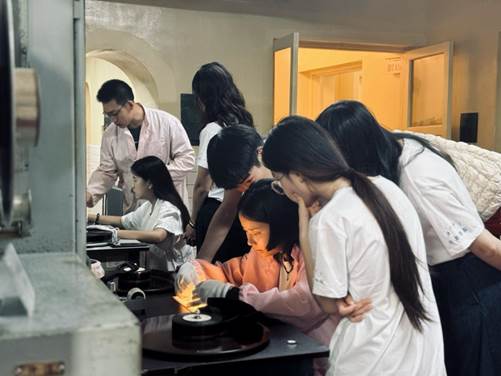 29日上午,实践队在长春长影旧址博物馆文化传播有限公司副总经理王冬的引导下考察中国红色电影修复工艺,参观中国现存最早、最完整的电影洗印工业遗址——长影旧址博物馆洗印车间,由此了解、体验胶片电影物理修复技术。长影洗印车间建于1937年,1939年正式投入使用,是中国现存年代最久远的洗印车间。该车间的洗片大厅生产线是中国唯一一条对外开放的电影洗印生产线,集中展现了电影胶片从冲洗底片到印制拷贝的生产过程。实践队近距离了解胶片电影洗印生产的技术工艺,学习硝酸、醋酸、涤纶等不同材质胶片进行物理清洁与修复的工艺差别,并在平面倒片台剪接、修复电影胶片。