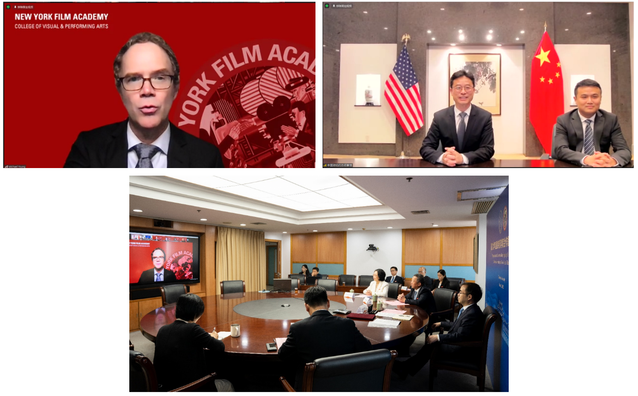 中华人民共和国驻纽约总领事馆、纽约电影学院中国办公室有关人员,我校国际合作与交流处、电影学院相关负责人参加签约仪式。