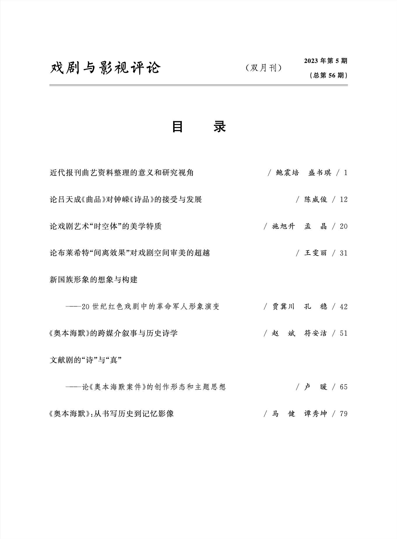 作者简介:王雯丽,厦门大学电影学院2018级硕士生,主要研究方向:西方戏剧理论。从戏剧审美变迁的角度来看,布莱希特的“间离效果”理论与实践是20世纪西方戏剧从时间审美转向空间审美过程中最重要的一步。“间离效果”理论分别在文本想象空间、观演空间和剧场建筑空间实现了戏剧时间审美到空间审美的彻底超越。在戏剧文本中,打破时间的线性叙事,置入“此在—彼在”的寓言结构,构建“符号空间”,塑造复调诗意的文本想象空间。在观演关系上,打破封闭幻象的交流模式,重塑演员—角色—观众的三元观演空间。在剧场建筑空间中,使布景设计、道具、身体等元素从配合剧情的装置变为富有空间语言的意义体系。深入剖析“间离”促进戏剧空间形成的机制,将为戏剧空间艺术创作方法提供审美溯源与启发。关键词:布莱希特;“间离效果”;空间审美;超越性思维